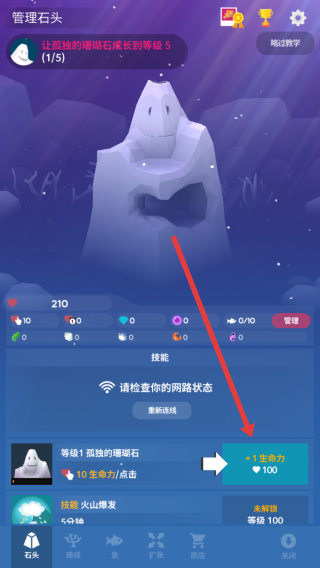 3、在管理石头界面,点击+1生命力按钮,消耗资源提升石头的生命力属性,助力完成成长任务。