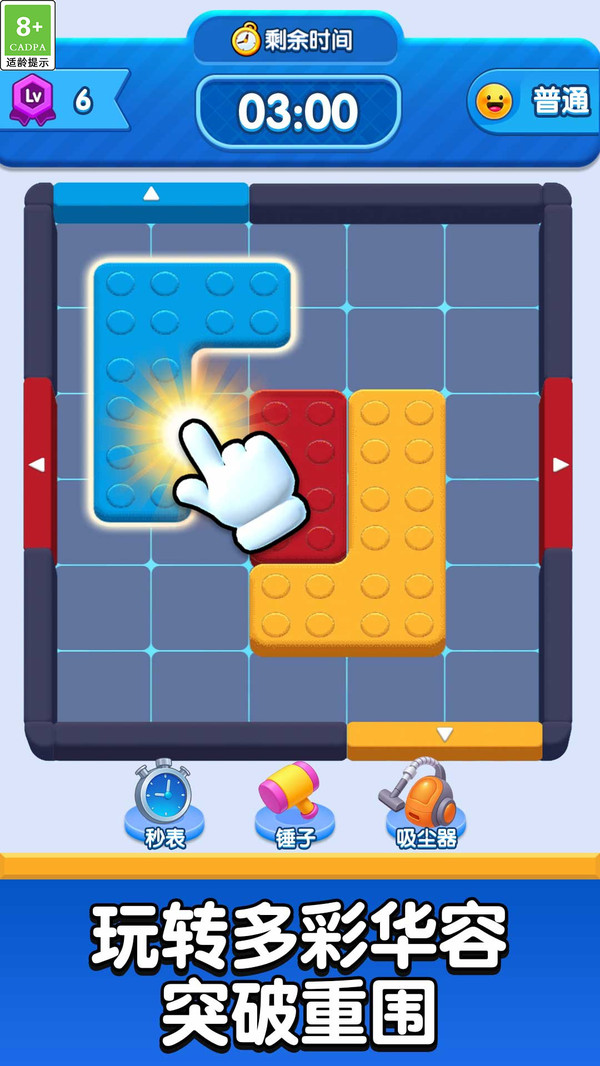 1.滑动操作为主:玩家通过手指滑动屏幕上的方块,移动路径中阻挡物,腾出空间让主方块依箭头方向顺利脱出关卡。