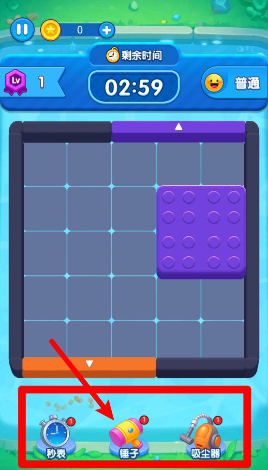 2.辅助道具系统:界面底部提供秒表、锤子与吸尘器三种道具,可用于暂停时间、敲除障碍或清除路径方块。