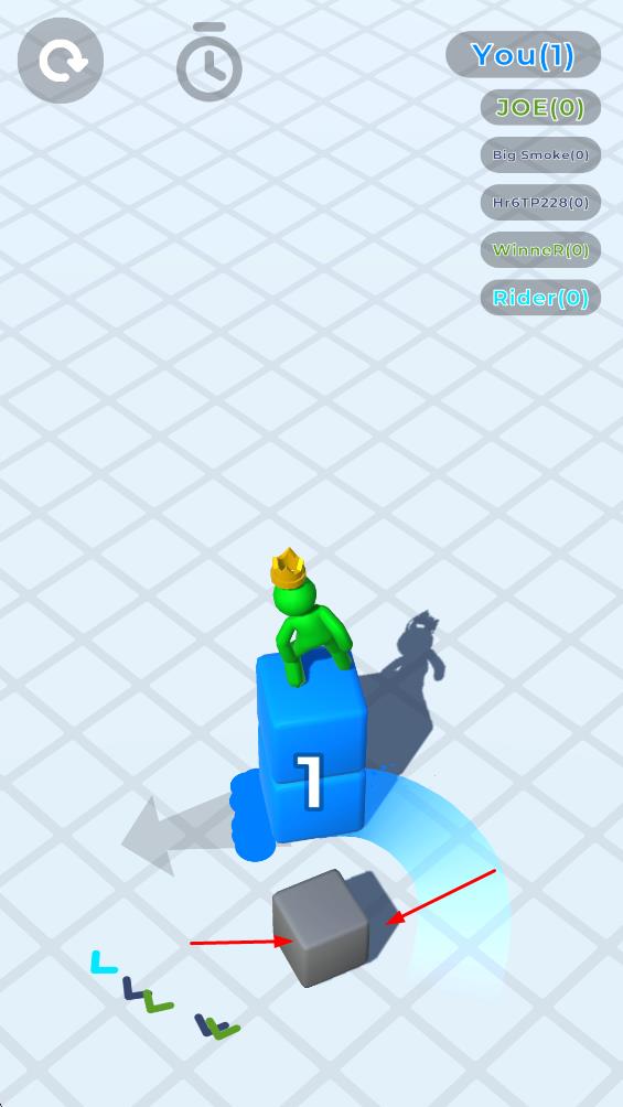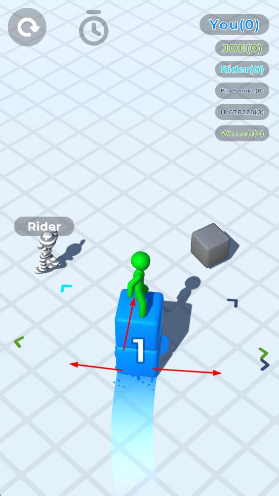 1、在网格场景中,通过屏幕方向箭头控制绿色小人移动,选择标有数字的方块作为初始占领点,站稳后得分开始累计。