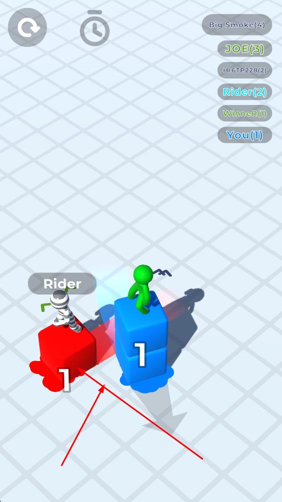 3、与其他玩家争夺方块资源,对手可能占领红色方块形成对抗,通过移动策略干扰对手占领,夺取其方块以增加自身得分。