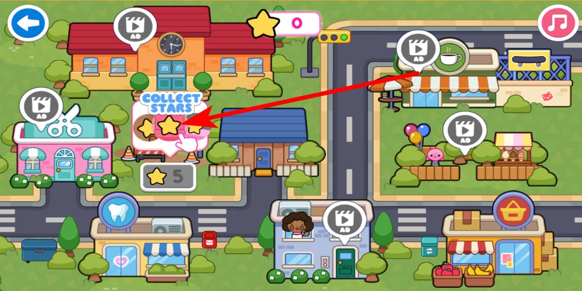 2、在场景中,分布着各种建筑和标识,点击它可收集星星,星星是游戏内重要资源,能用于解锁新物品、装饰房屋等,助力玩家更好地打造专属家园。