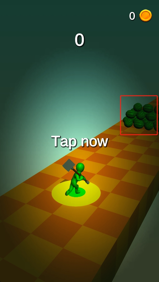 1、进入作品后看到点击提示,迅速点击屏幕,让拿斧头的绿色小人动起来,朝着右侧西瓜堆跑去,准备砍碎西瓜拿分数。