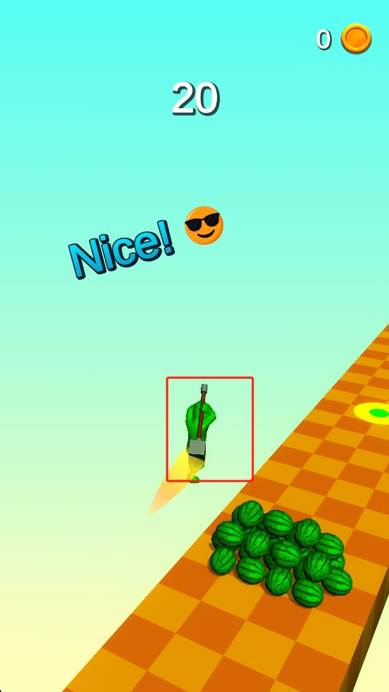 2、小人碰到西瓜堆后,持续操作,让它用斧头砍西瓜,触发加速效果时,借着速度快速通过,同时躲着障碍,保持砍瓜节奏。