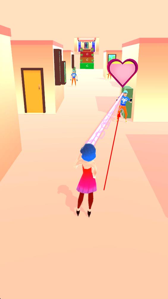 1、控制角色发射爱心光束,击中场景内目标将其转化为蓝色服装的追随者,壮大队伍规模,为后续挑战奠定基础。