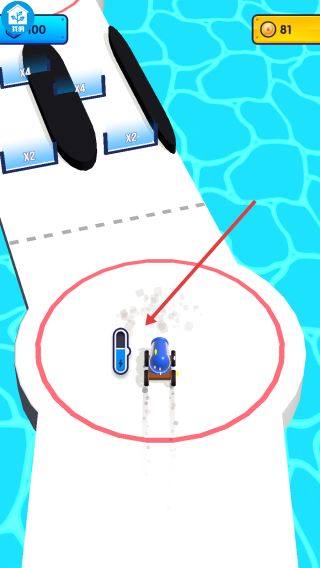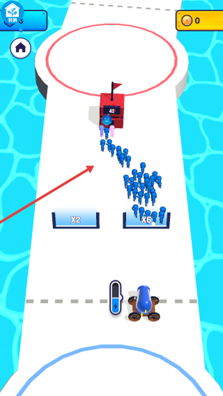 1、进入游戏,滑动屏幕移动蓝色小车,途经X2,X6等倍增区域,收集人员壮大队伍,目标是攻占红车。