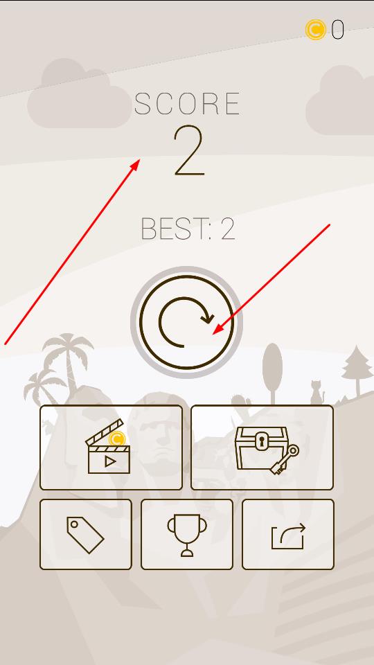 3、角色失败后,界面展示当前SCORE如2与BEST记录,点击中间重置按钮,重新开始挑战,冲击更高分数。