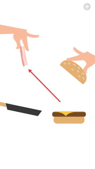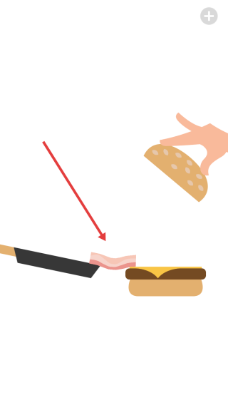 1、进入游戏,按提示拖动食材,如面包片、肉饼等,有序叠加,组合成培根芝士汉堡,注意摆放顺序。