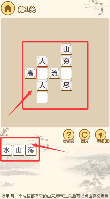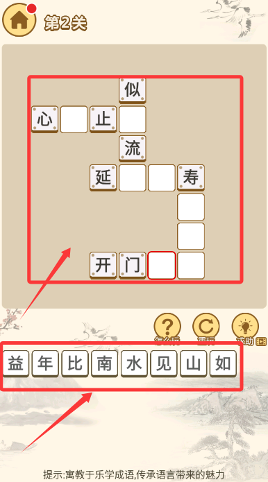2、观察题目提示,将散落的汉字拖入答题区,组成正确典故成语。