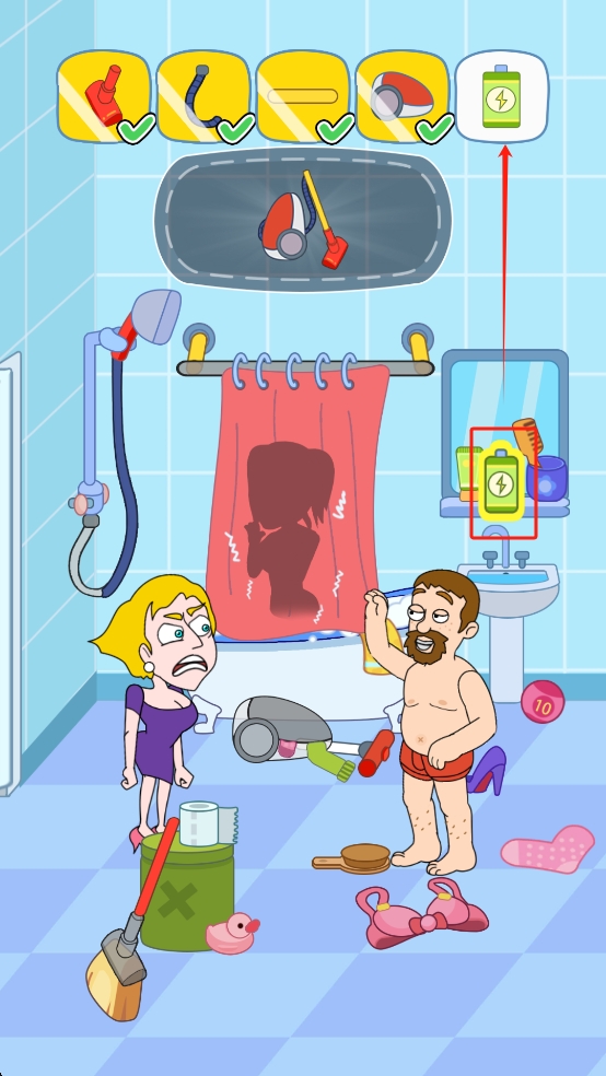 2、最后拖绿色电池到洗手台对应位置,完成吸尘器组装,让工具栏全部打勾,触发后续剧情。