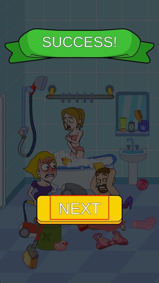 3、成功解决后出现SUCCESS界面,点击下方的NEXT按钮,进入下一关,继续挑战浴室场景的解谜任务。
