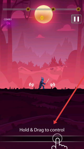 1、在游戏初始界面,按住底部Hold&Drag-to-control区域拖动,操控武士在月夜场景移动,准备迎战敌人。