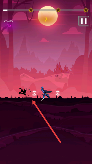 2、拖动屏幕控制武士移动方向,挥刀攻击黑色敌人,积累Combo与分数,推进关卡战斗进程。
