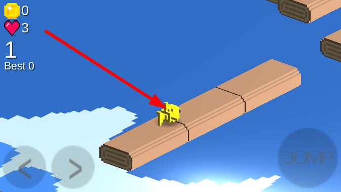 2、用左右按键控制角色移动,沿箭头方向在木板上前行,注意保持平衡,避免掉落,收集金币提升分数。