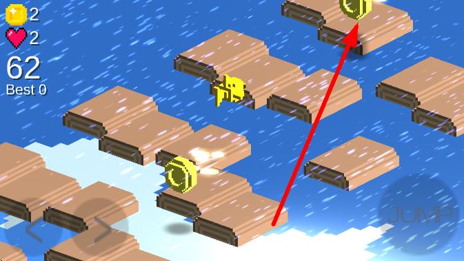 3、遇到高空木板间隔,把握时机按跳跃键,跨越间隙,获取更高处金币,同时留意血量,躲避危险,刷新记录。
