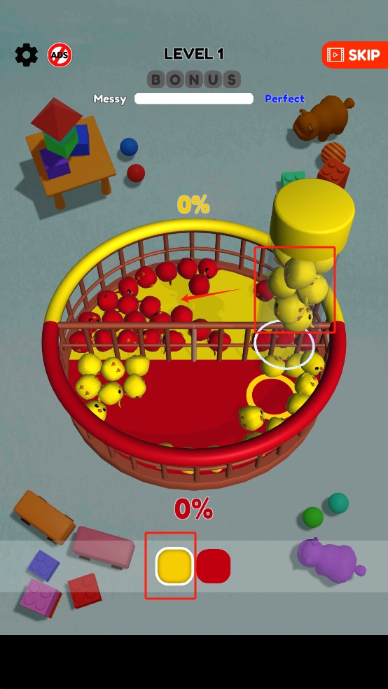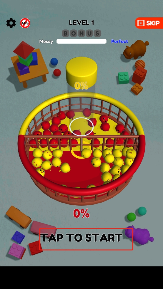 1、点击屏幕下发的按钮开始游玩,目标是把红、黄两类小球,分别用对应颜色的圆柱工具,归置到各自颜色区域。