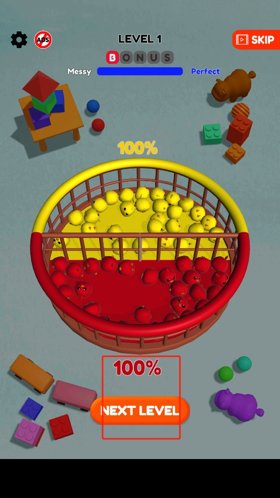 3、两类球都归位、进度达100%后,点击NEXT LEVEL,进入下一关,继续挑战更复杂的分类整理任务。