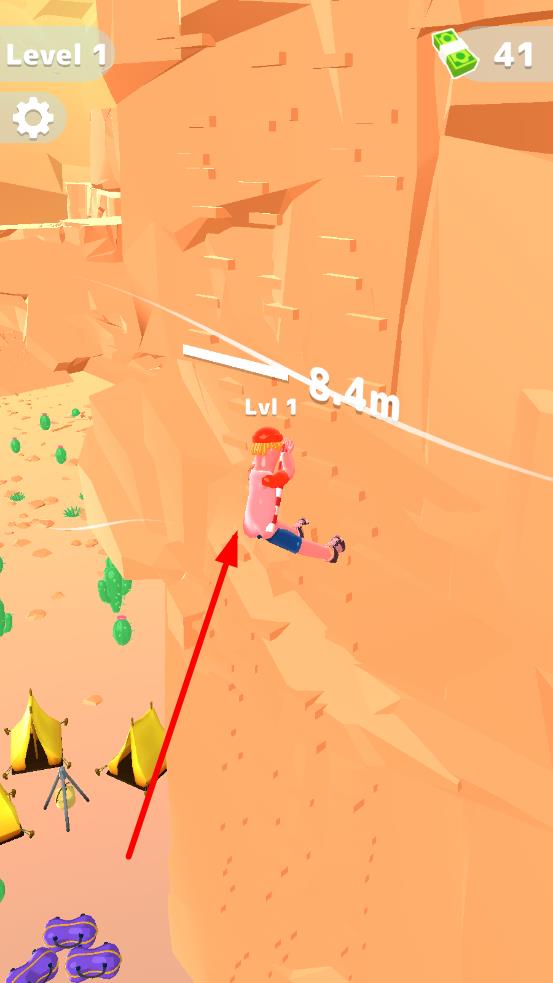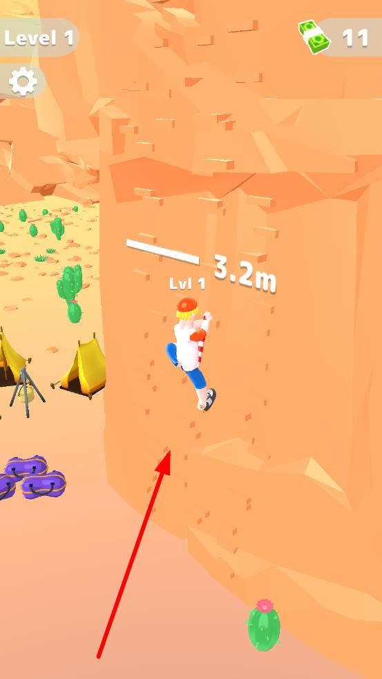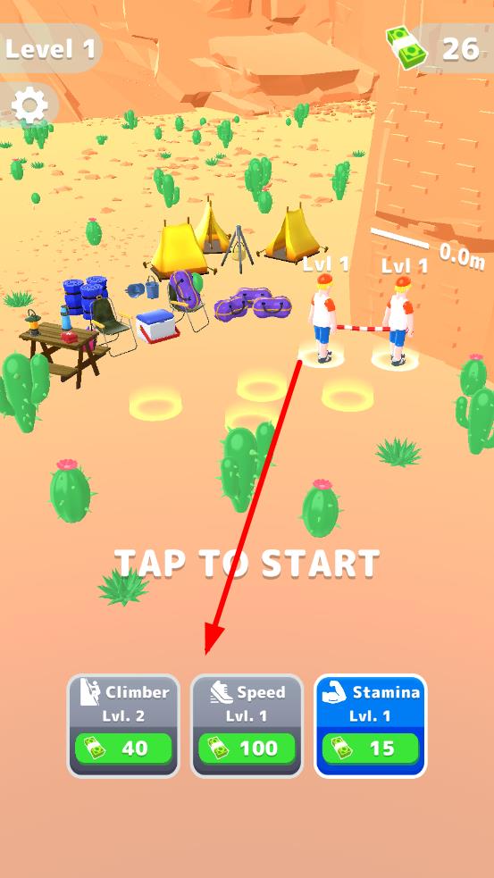 1、进入Level 1,点击TAP TO START,角色前往沙漠悬崖,可消耗金币升级攀爬、速度、耐力等属性,强化初始攀登能力。
