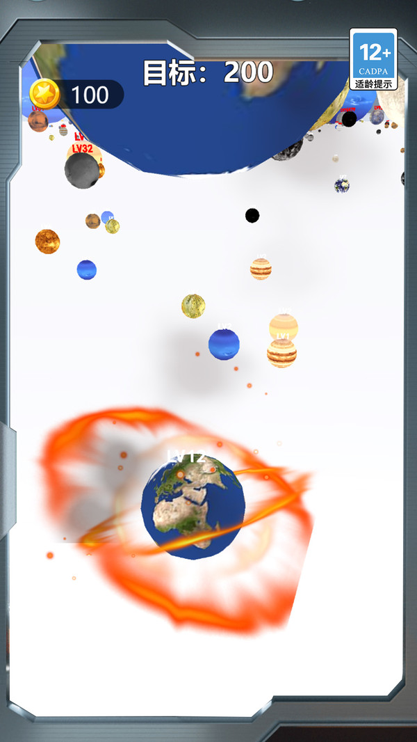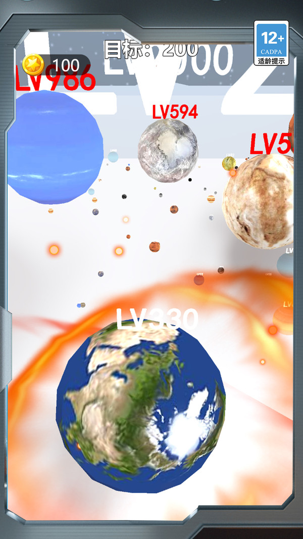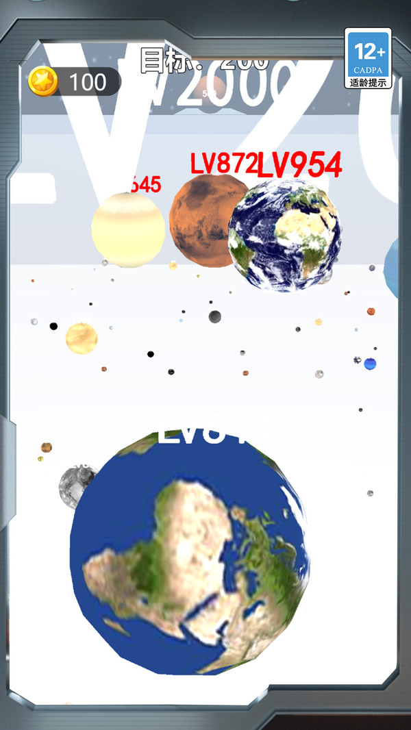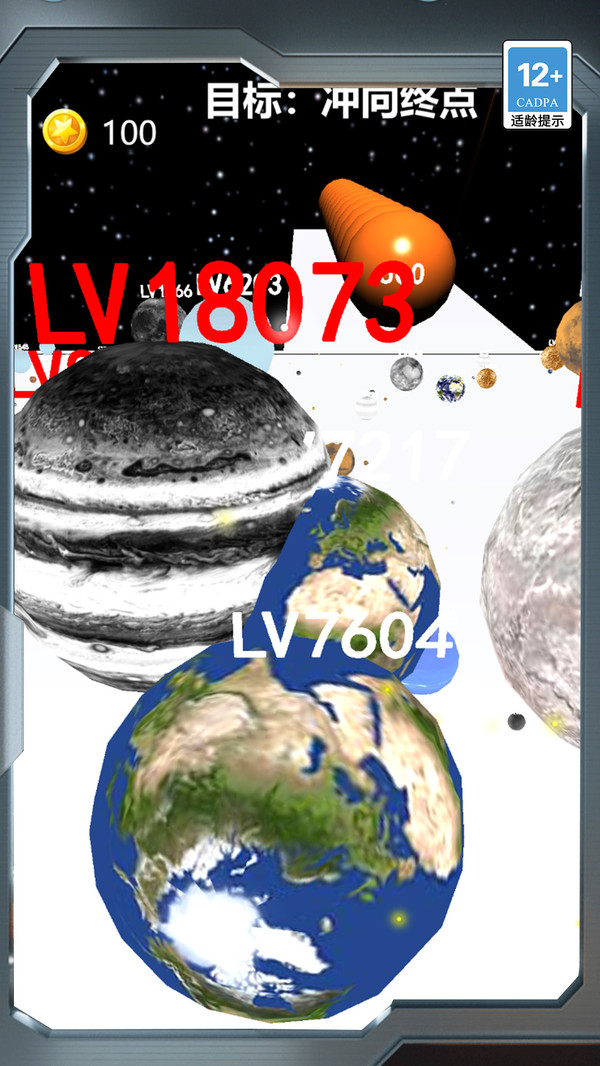 1.星球等级挑战:通过不断吞噬低等级星体,让自己快速升级挑战LV18073的庞大星球对手。