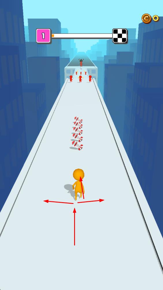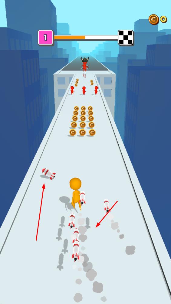 2、在跑道上遇到红色小人敌人时,利用收集到的火箭道具,点击发射火箭将其击败,同时持续收集金币,为挑战更强敌人奠定基础。