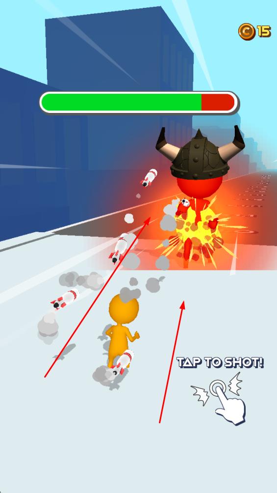 3、面对大型BOSS时,依据TAPTOSHOT!提示,点击屏幕发射火箭精准攻击,击败BOSS推进关卡,同时关注进度条,朝着通关目标努力。