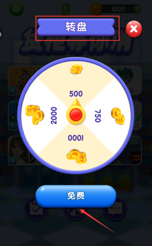 3、点击红框免费按钮,启动转盘抽奖获取金币。