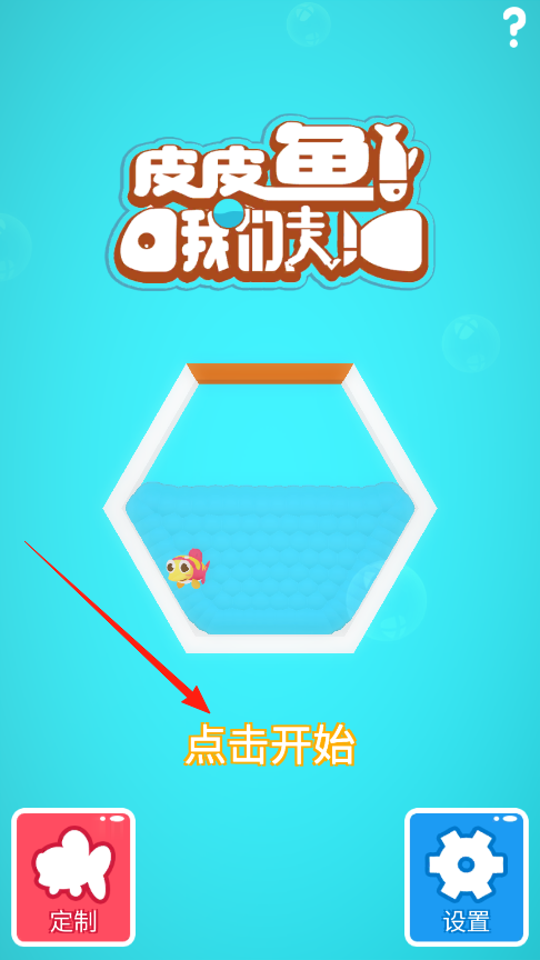 1、点点击开始就能进入游戏,皮皮鱼会在六边形鱼缸里游来游去等你来玩,左边红色定制按钮可以给小鱼换造型,右边蓝色设置能调音量或看游戏说明,界面清爽又容易上手。