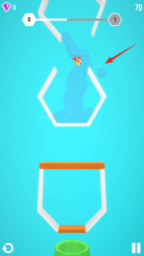 2、控制皮皮鱼顺着蓝色水流游进下方容器,注意看上方进度条从0到1的变化,右上角显示当前得分70分,游得越准分数越高,要把握好方向才能完美通关哦。