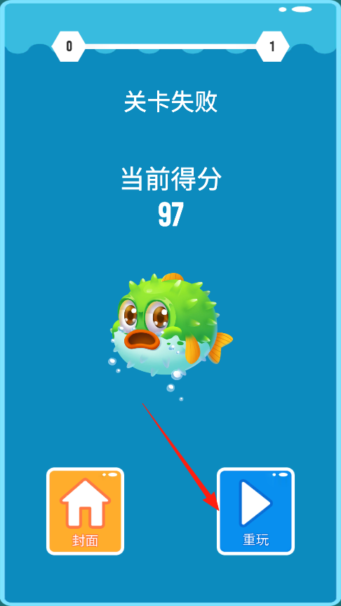 3、得分97分时游戏结束,绿色河豚会冒泡安慰你,点重玩按钮能马上再试一次,想休息就按封面回主界面,箭头提示推荐你先练习再挑战。