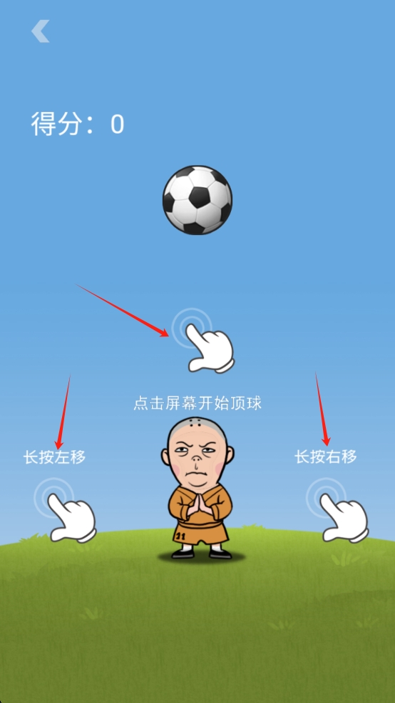 1、开局点击屏幕中间区域开始顶球,足球下落时,通过长按左侧的区域或右侧的区域,调整人物位置。