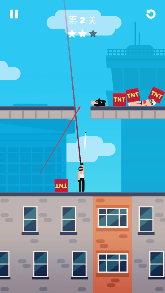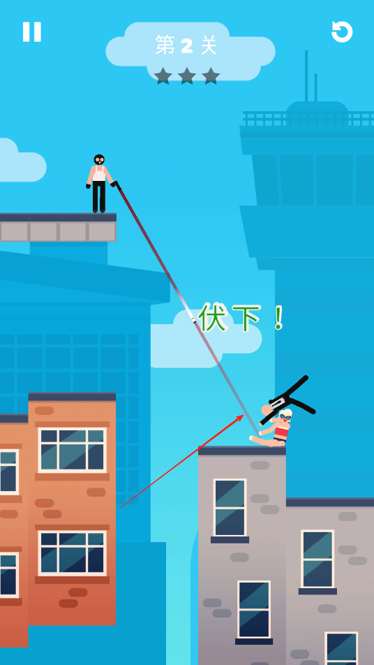 1、游戏开始一会后,歹徒会发射子弹,我们需要将弧线对准VIP,扑过去将VIP推离射击范围。