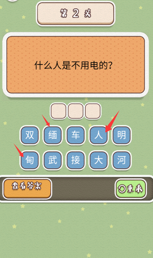 4、第二关答题,什么人是不用电的?答案是缅甸人。