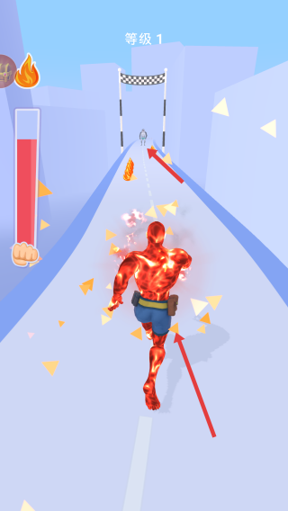 2、当收集到足够的火焰道具后,角色会变身为强大的形态,继续在赛道上奔跑,躲避障碍物,快速前进。