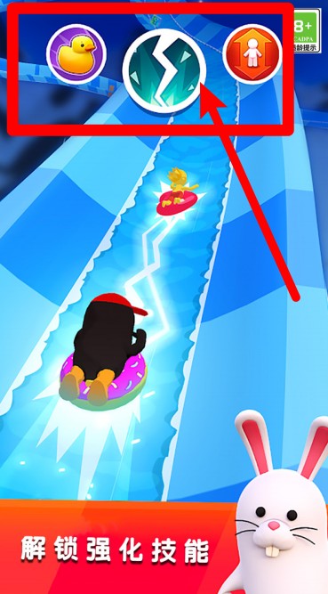 3.技能图标说明:滑行途中可触发不同技能图标,如加速、撞击、防护等,灵活使用可改变比赛局势取得胜利。