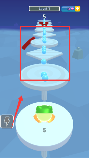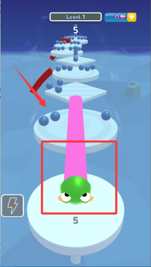 1、进入游戏后先控制青蛙伸出舌头,瞄准有豆子的平台黏住,等舌头收回后就能跳到那个平台上继续前进。