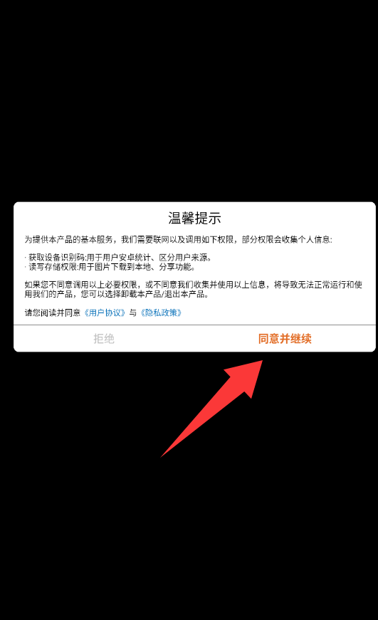 1、点击温馨提示里的同意并继续。