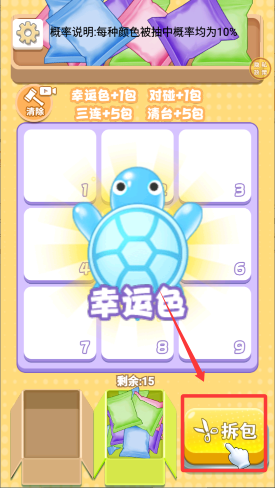2、许愿机制增加游戏趣味性,开局前选择心仪颜色许下愿望,拆出对应颜色乌龟可获得额外奖励,这种随机惊喜元素让每局游戏都充满期待和可能性。