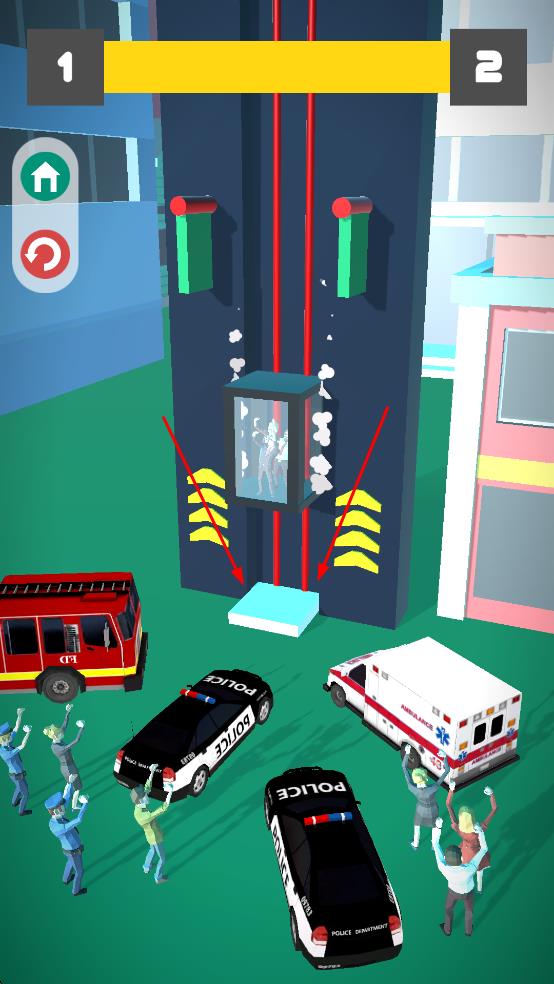 1、关卡初始,点击绿色横杆使其展开,承接下落的玻璃电梯,防止箱内人员坠落。