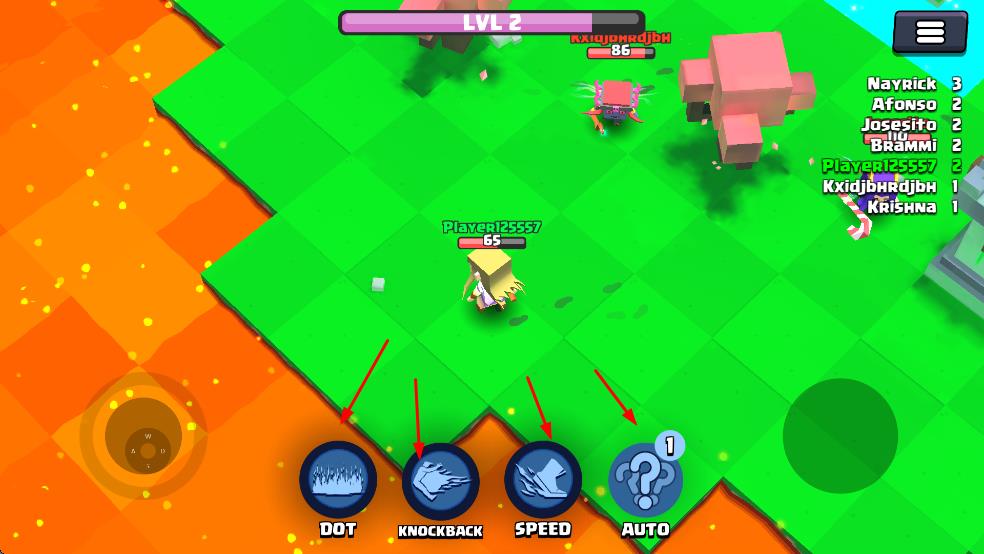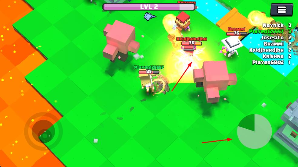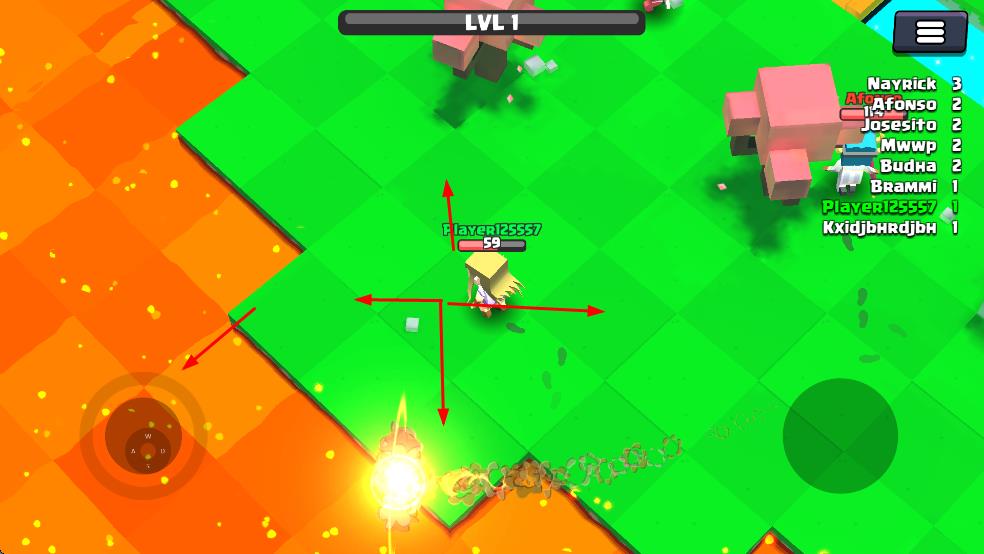 1、操控角色沿箭头方向移动,避开橙色岩浆区域,留意周围玩家位置规划路线。
