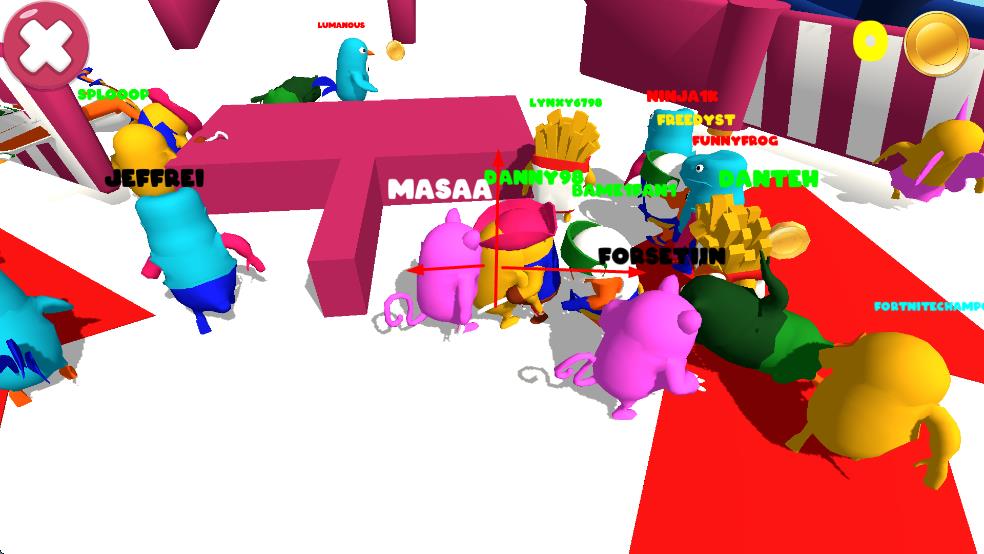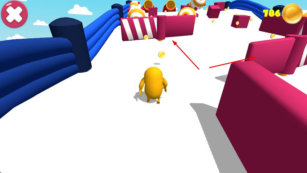 1、多人混战全力冲刺:六十名玩家同时进入关卡,通过跳跃、躲闪、推进等动作在场景中移动,避免被对手碰撞或掉落陷阱,在混乱中找准路线,向着终点全力冲刺。