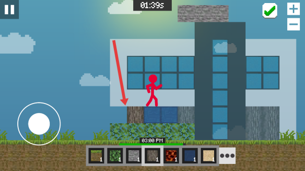 2、在游戏场景中操控红色角色移动,点击下方方块栏选择建筑方块,为房屋搭建准备材料,规划建造布局。