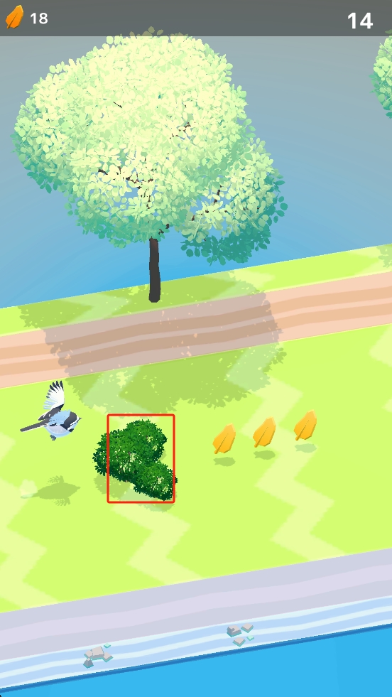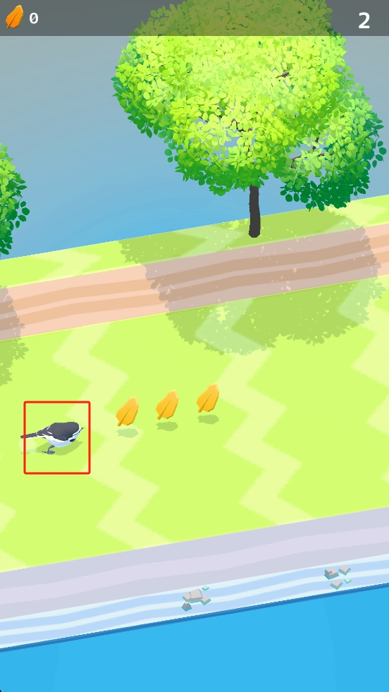 1、操控小鸟沿路径前进,跟随黄色叶片指引,注意避开如红框中黑色小鸟等障碍,保持移动节奏。