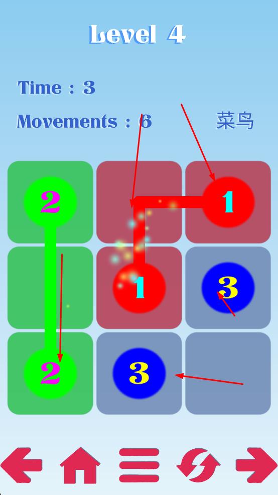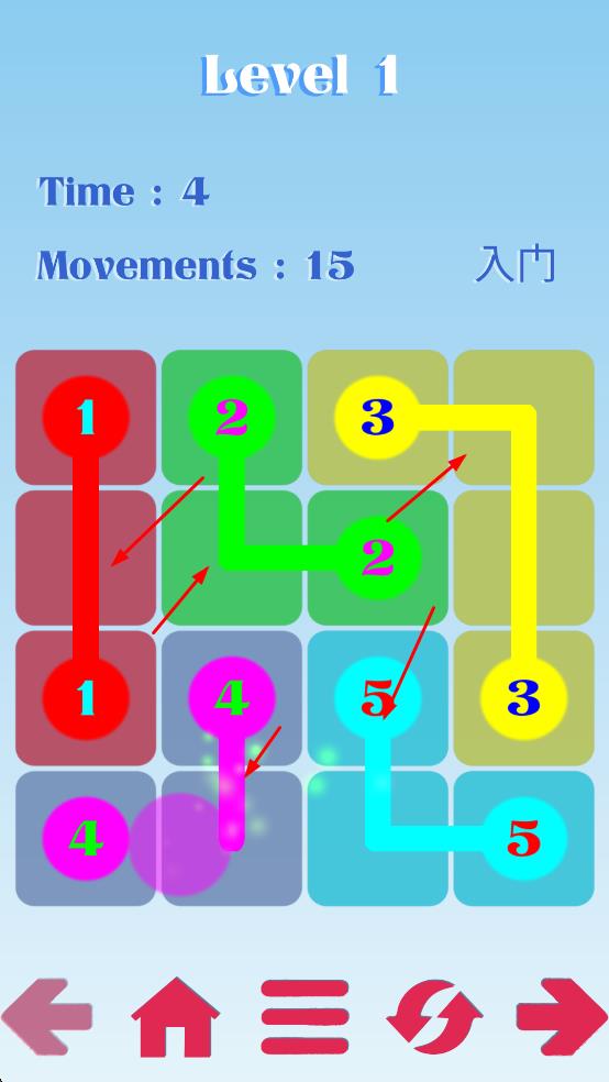 1、连接同数字同色的方格,绘制连线,达成关卡目标。
