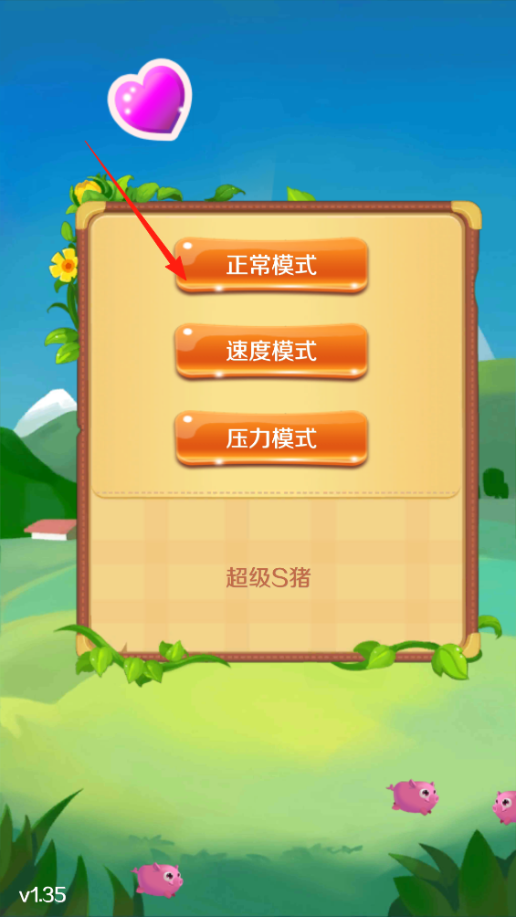 1、进入游戏选模式界面,有正常速度压力三种模式,选正常模式就按常规节奏玩,慢慢找粉色小猪,收集爱心,体验轻松的闯关过程,适合刚开始玩的人。