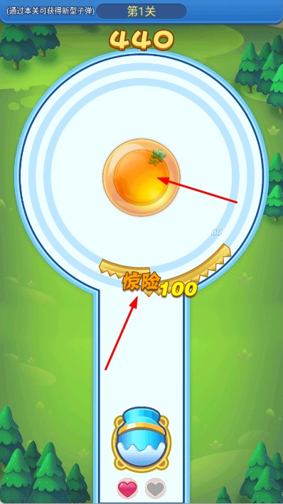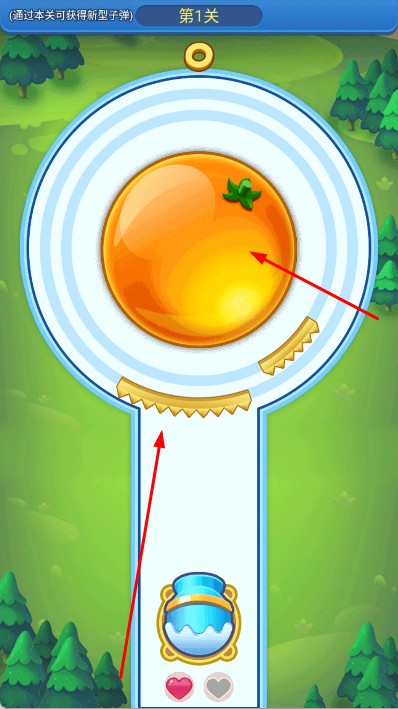 2、在关卡中,通关操作控制蓝色发射装置,发射弹珠击打圆形轨道上的水果,利用轨道上的锯齿等机关,使其体积变小。