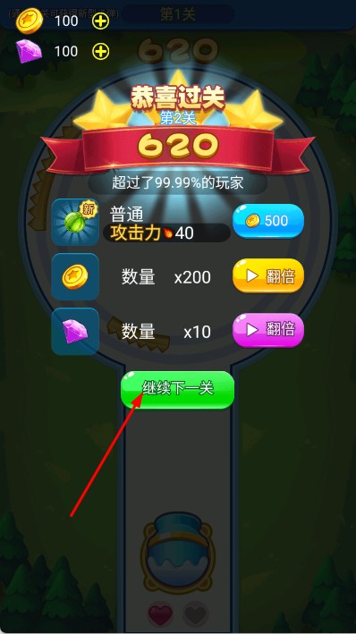 3、持续击打水果,当水果体积缩小到一定程度,成功通过轨道障碍,完成关卡目标,点击继续下一关。