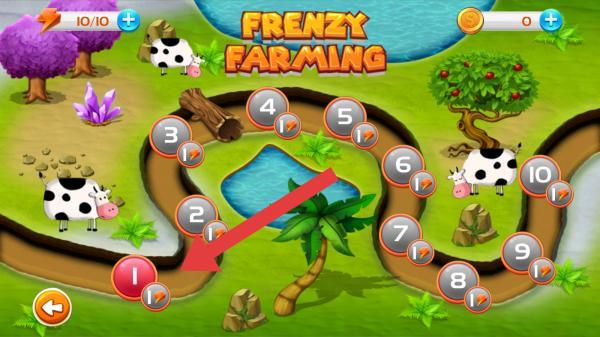 2、展示1-10关的关卡选择,目前只有1处于解锁的状态,其余暂未解锁,玩家需要一步一步进行游玩解锁后面的关卡。