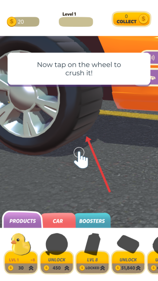 1、按照提示点击上方的车轮,需要碾碎目标的物品,Level1中,先点车轮压物,完成目前的关卡。