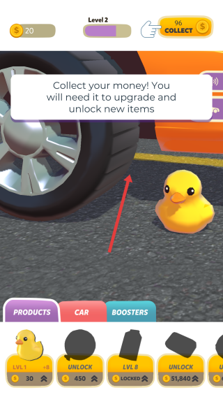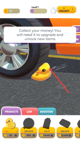 2、关卡结束,点击COLLECT收集金币,用于解锁如450金币解锁新物品、升级小黄鸭LVL1需30金币道具。