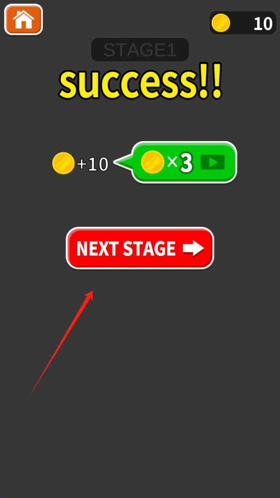 3、成功通关后,点击红色NEXT-STAGE按钮,获取金币奖励并进入下一阶段,点击下一关。
